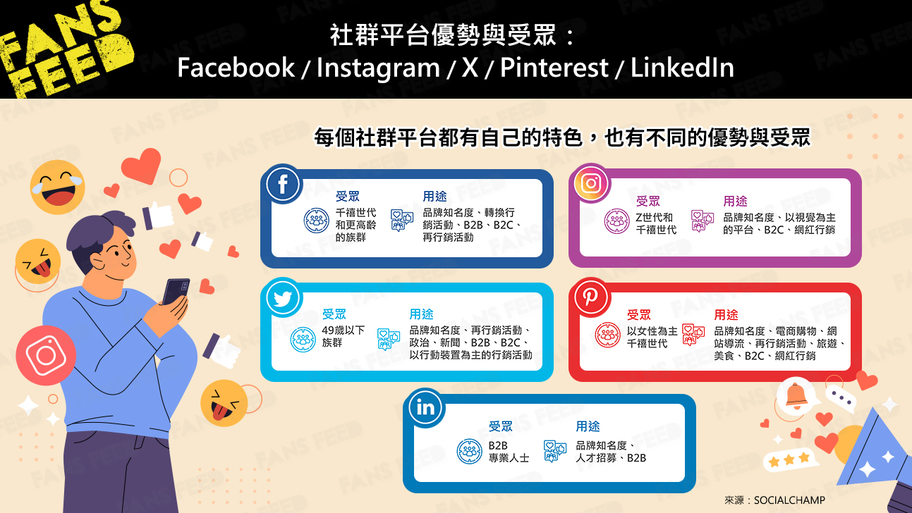 假設你是一位教練,在所有社群平台發佈一模一樣的內容,就像一個教練用相同的語氣對所有學員說一模一樣的話。每位學員的個性、人生目標和學習能力都不一樣,所以即便你的建議大同小異,說話方式還是要因人而異。社群平台的道理也是如此,它們也有各自的個性,每個平台都有自己的演算法、受眾和溝通習慣,所以絕對不能把一樣的模式完全直接套用到其他社群平台上。以下是各社群平台,包含 Facebook、X、Instagram、Pinterest、LinkedIn 的受眾分佈與常見用途。